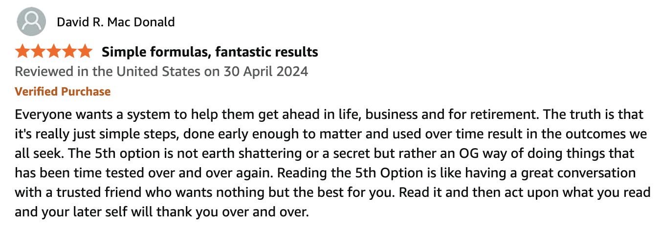 "Walter Young has been one of my financial advisors for over 10 years now. I’m also a huge fan of his book, The 5th Option. It is one of the best books in all of finance I've ever read.